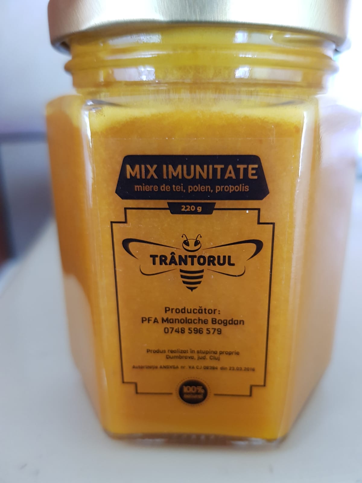 Mixul de imunitate din miere, polen crud si propolis utilizat zilnic, sustine imunitatea organismului, Il intareste iar pe cei mici ii ajuta sa treaca mai usor de racelile din sezonul rece. Polenul este foarte bogat mai ales in vitamine din complexul B (B1, B2, B3, B6, B12), antioxidanti, inclusiv betacaroten, vitamina C si vitamina E, acid folic, provitamina A. Cele mai importante minerale care se gasesc in compozitia polenului sunt calciu, fosfor, potasiu, fier, magneziu, iod.