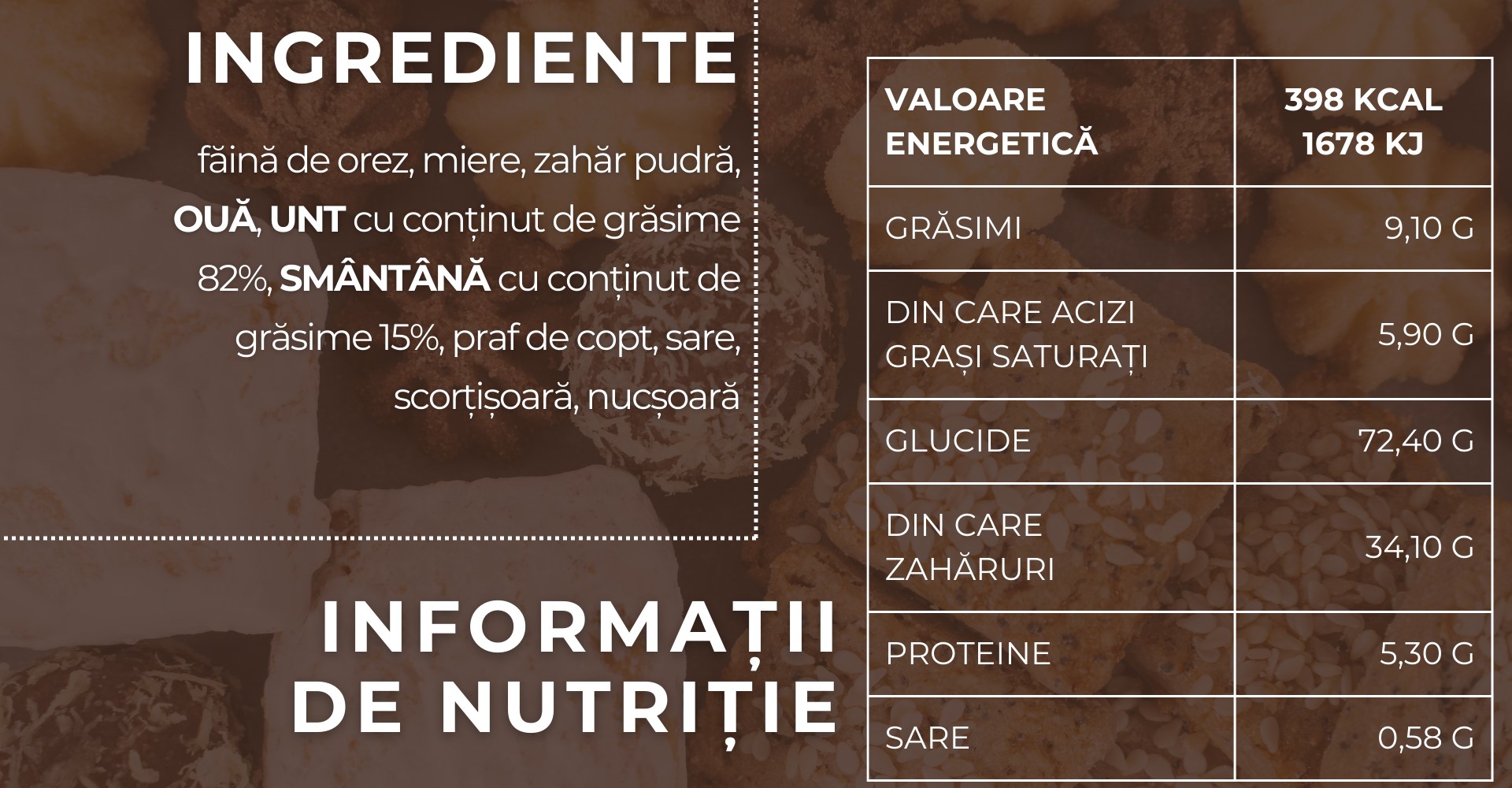 Ingrediente: faina de orez, miere, zahar pudra, OUA, margarina 72% (uleiuri si grasimi vegetale (palmier, rapita), apa, praf (LAPTE), 0,2% sare, emulgator (lecitina din floarea-soarelui), aroma naturala, vitamine (A, D); smantana, praf de copt, sare, scortisoara, nucsoara.