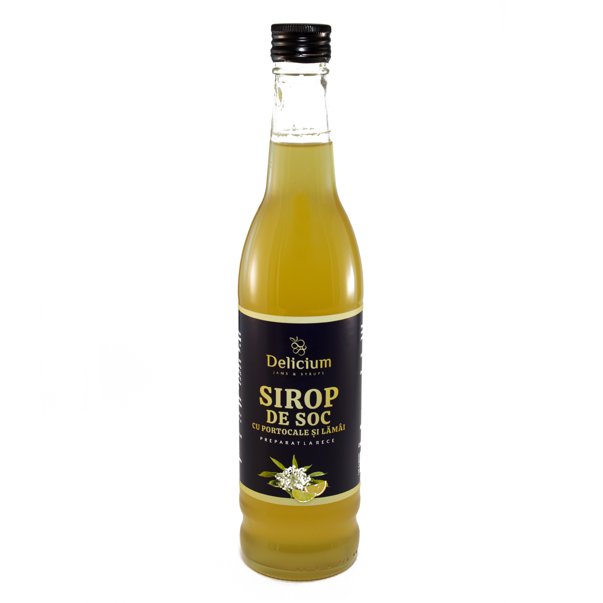 Ingrediente: Obținut prin macerarea la rece a florilor de soc, suc proaspăt de portocale, suc proaspăt de lămâi, zahăr, apă, acid salicilic.